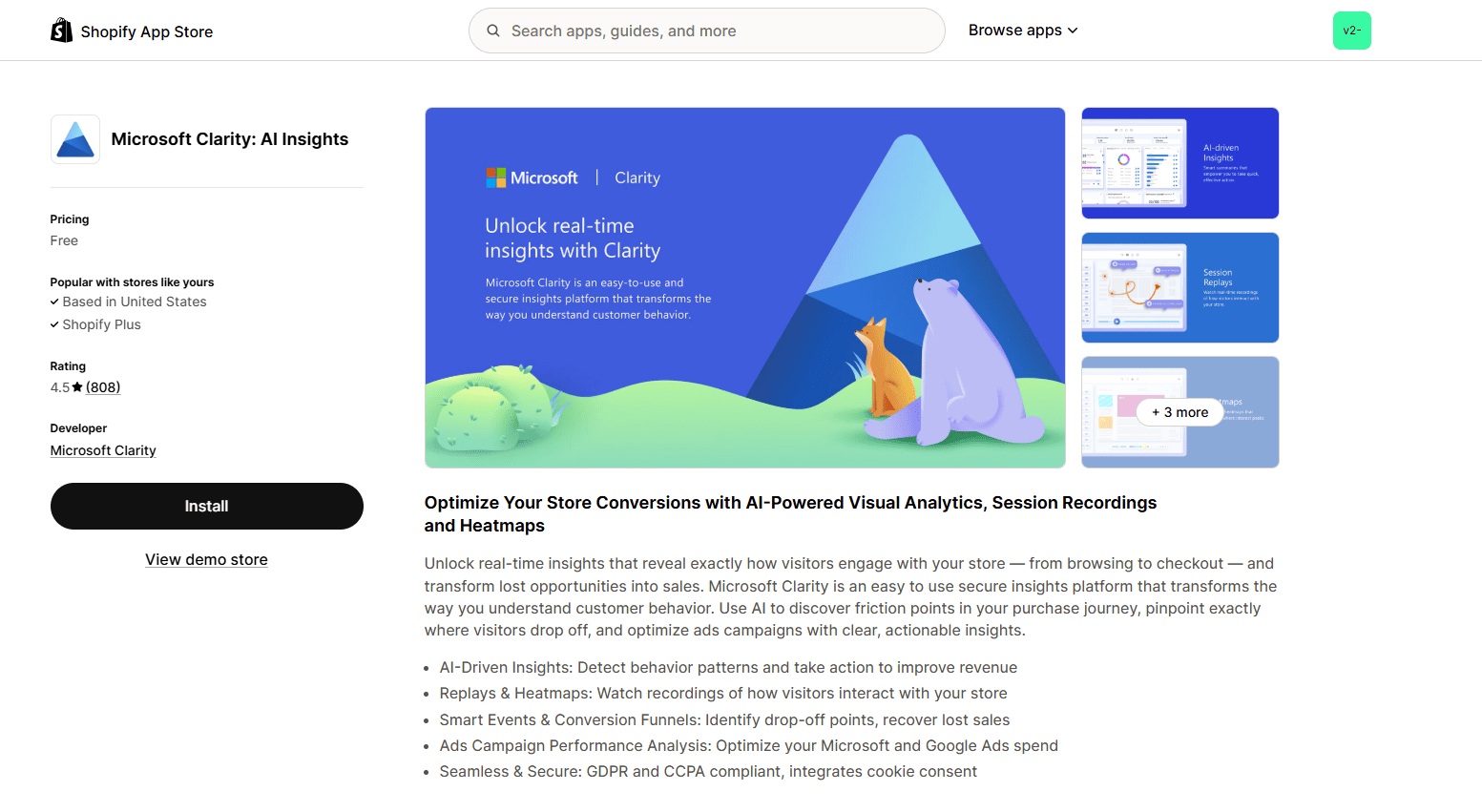 Microsoft Clarity is a free Shopify Analytics app focused on visual behavior insights and UX diagnostics. It records full visitor sessions, generates heatmaps for clicks and scroll behavior, and identifies key interaction patterns such as rage clicks and friction points.