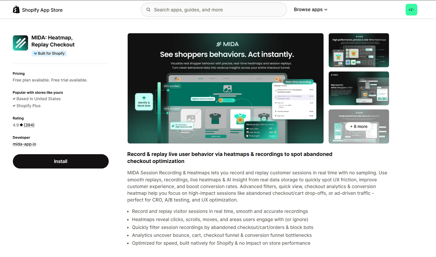 MIDA is a Shopify Analytics app focused on behavioral conversion analysis and funnel diagnostics, built to help merchants pinpoint exactly where visitors encounter friction and abandon purchase flows. It captures real user session recordings, detects rage clicks and dead clicks, maps visitor journeys through checkout steps, and links behavior directly to specific orders and customers.