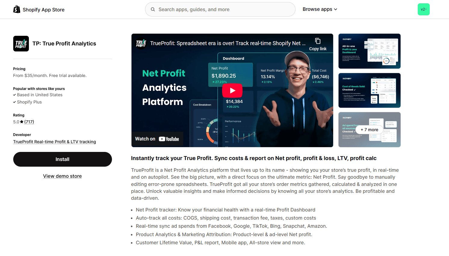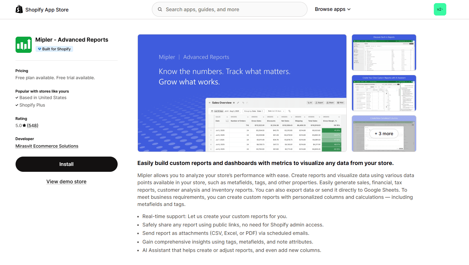 Some apps specialize in custom reporting (Report Pundit, Mipler), others focus on behavioral analytics (Microsoft Clarity, MIDA, Propel), while profit-focused tools (TrueProfit, Lifetimely) emphasize LTV, P&L, and ad spend tracking.