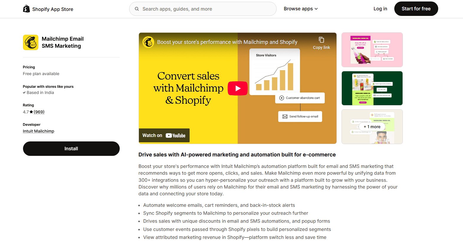 Klaviyo is a mature Shopify email marketing app that connects to Shopify and synchronizes products, customers and orders in real time. Post installation the app claims to collect every site event like views, carts, checkouts and purchases to trigger intelligent flows and messages. Klaviyo’s built-in AI reads the connected Shopify site to suggest store specific campaigns and flows, even generating the design & subjectline copy.
