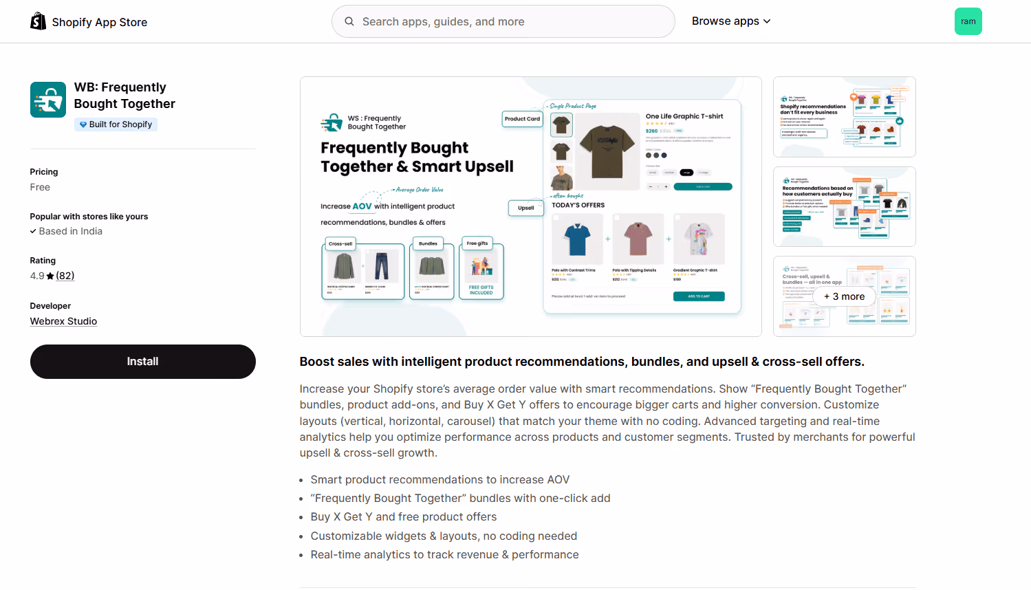 WS: Frequently Bought Together by Webrex Studio is a Shopify Frequently Bought Together app focused on FBT bundles & Buy X Get Y offers. It is positioned as a cost-effective option with a generous free plan and strong customization.