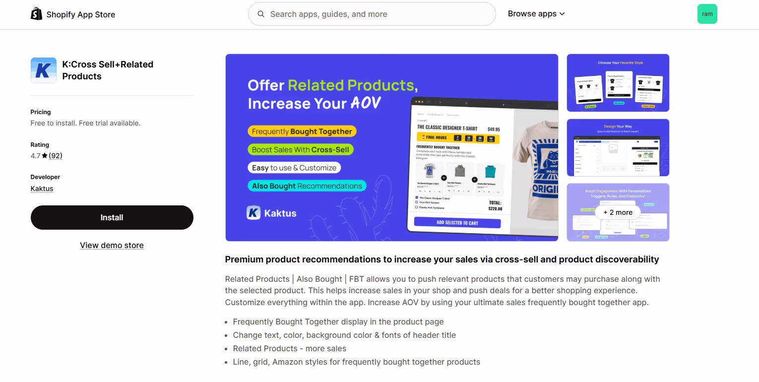 K: Cross Sell + Related Products by Kaktus combines Frequently Bought Together, related products, and Also Bought widgets into a single cross-sell solution. It is designed for merchants who want strong visual customization and multiple recommendation formats without managing multiple apps.
