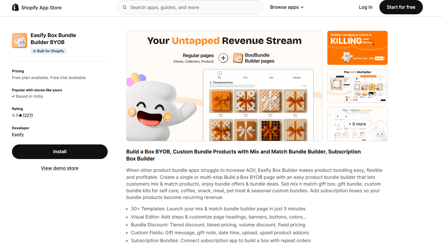 Easify Box Bundle Builder BYOB is a strong fit for smaller stores because it offers a free entry tier, template-based setup, and a visual editor that reduces implementation effort.