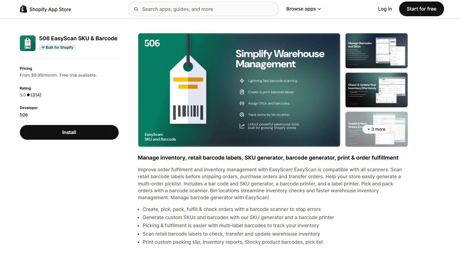 506 EasyScan SKU & Barcode is a Shopify inventory management app focused on barcode-scan fulfillment and SKU/barcode generation. It is the only app in this comparison built around a scan-to-pick-pack-ship workflow with bin locations, transfer orders, and label printing. Best suited for stores with physical warehouses or fulfillment teams that need to eliminate shipping errors. Its main limitation is that it is a fulfillment and operations app, not a forecasting tool: there are no AI reorder suggestions or demand predictions, so most stores pair it with a forecasting app for full inventory coverage.