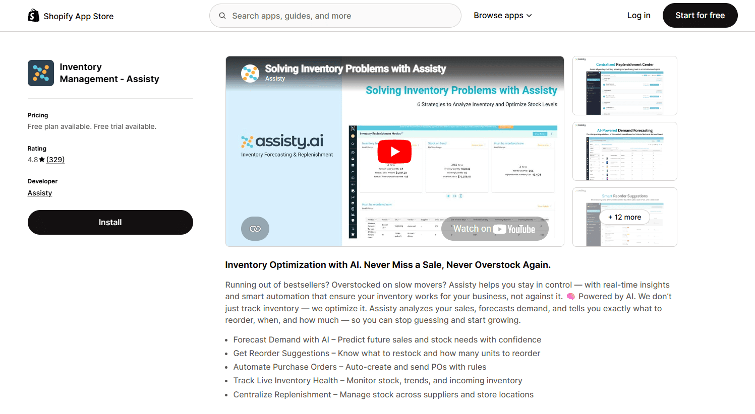 Inventory Management: Assisty is a Shopify inventory management app focused on AI demand forecasting and analytics depth. It ships with 300+ pre-built sales and inventory reports plus a Google Sheets integration that turns store data into custom dashboards. Best suited for data-driven Shopify stores running large catalogs that need detailed reorder suggestions and multi-location replenishment. Its main limitation is the pricing structure: full AI/ML demand forecasting and the purchase-order module are gated to the $239/month Plus tier, while the lower tiers cover reporting and basic replenishment only.