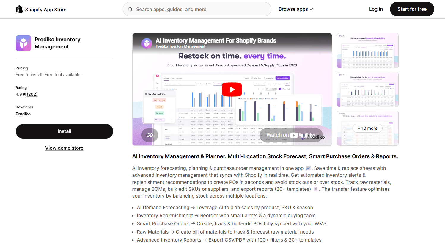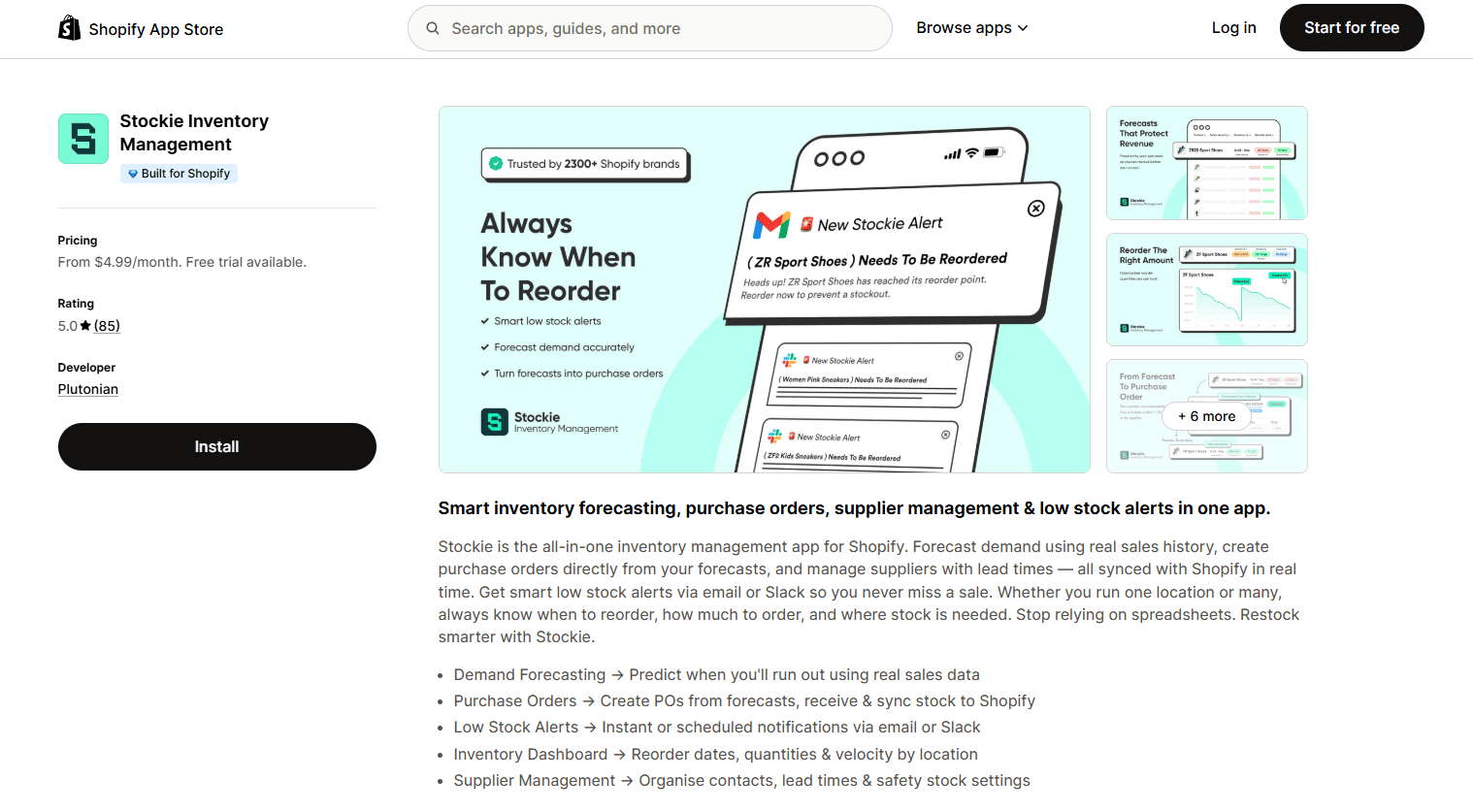 Stockie Inventory Management is a Shopify inventory management app positioned as a lightweight Stocky replacement for SMB stores. It carries the Built for Shopify badge and starts at $4.99/month, making it the most affordable entry point in this guide. Best suited for SMB Shopify stores migrating off Stocky who want clean low-stock alerts, sales-history forecasting, and supplier-aware purchase orders without enterprise-tier pricing. Its main limitation is depth: it relies on sales-history forecasting rather than AI/ML, and the Basic tier caps at 8,000 variants.
