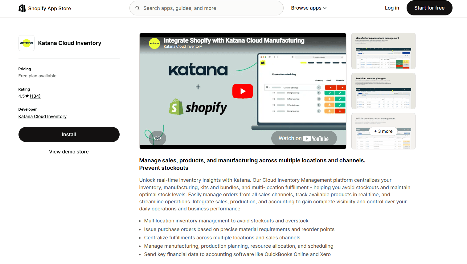 Katana Cloud Inventory is a Shopify inventory management app built for makers and small-scale manufacturers who need full Manufacturing Resource Planning (MRP) on top of standard inventory. It is the only app in this comparison with deep Bill of Materials (BOM) tracking, subassemblies, and production scheduling. Best suited for Shopify brands that produce their own goods: apparel, cosmetics, food and beverage, leatherwork, and assembly-based products. Its main limitation is a pattern of price increases mid-contract reported in reviews, often tied to changes in the billing model (per-user, per-order line item, or GMV).