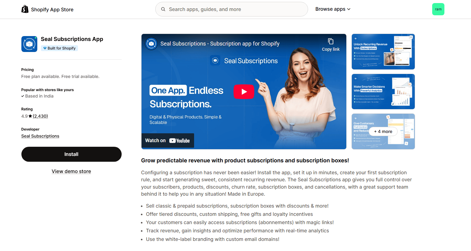 Seal Subscriptions is a Shopify subscription app that focuses on affordability with flat pricing and no transaction fees while covering most core subscription use cases.