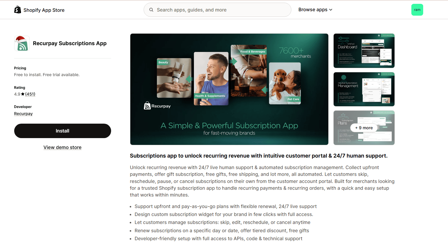 Recharge Subscriptions is a mature Shopify subscription app built for scaling brands, offering unified checkout, automation, retention tooling, and deep ecosystem integrations.