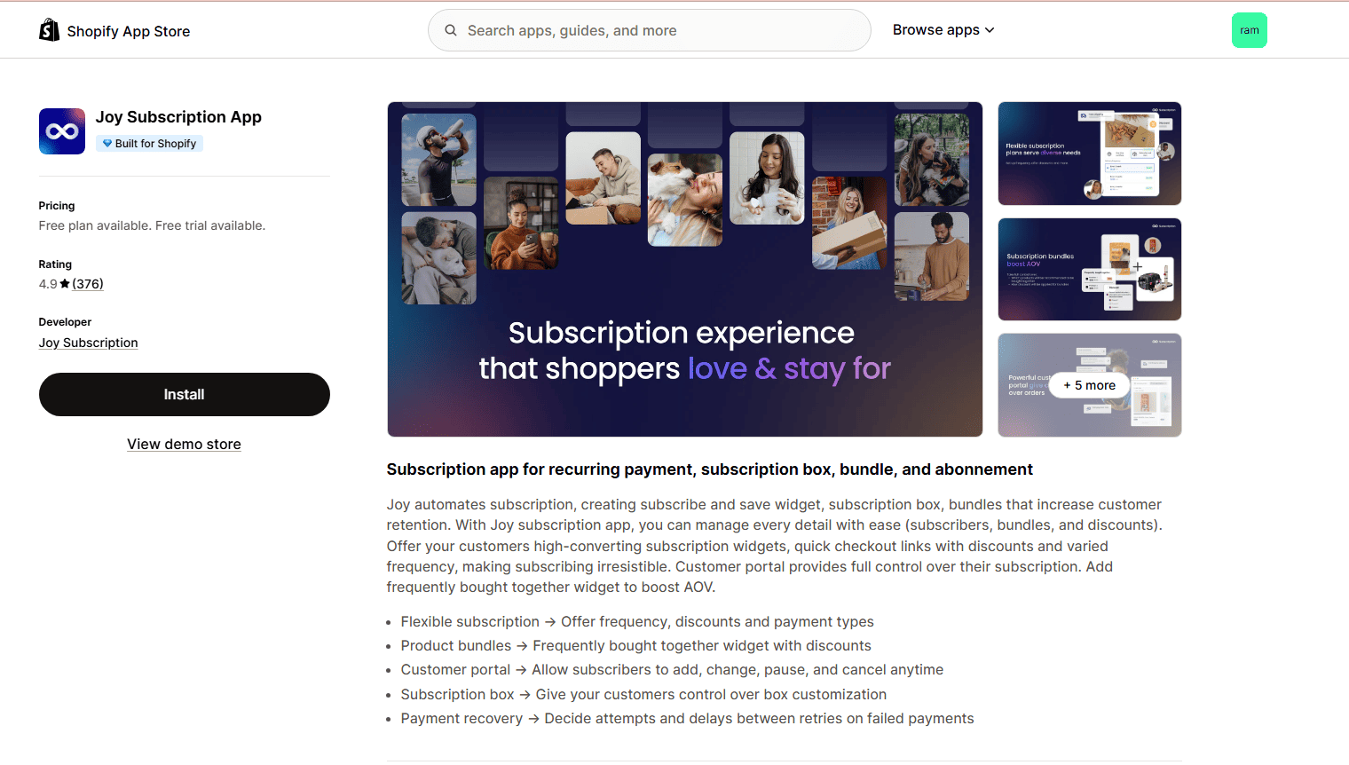 Joy Subscription is a Shopify subscription app that prioritizes ease of use and fast deployment for subscription and bundle offers.