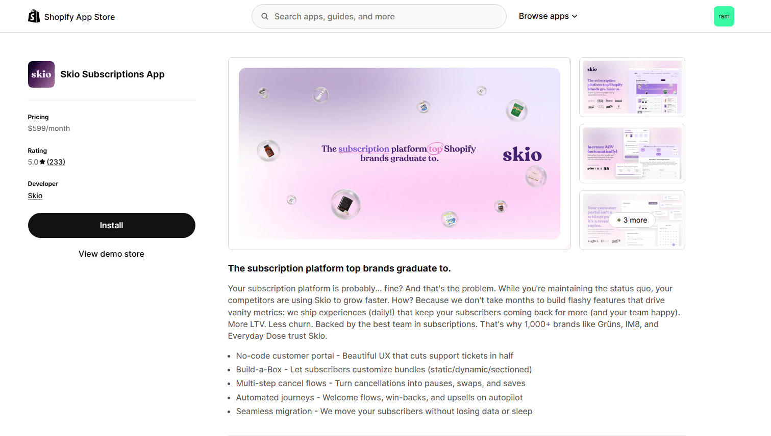 Skio Subscriptions is a Shopify subscription app built for high-volume DTC brands needing advanced lifecycle automation and premium support.
