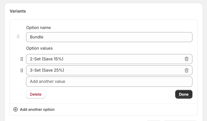 Instead of creating a separate product, you can use variants to give customers bundle choices right on a single product page. This works well if you’re offering different pack sizes - for example, “Single,” “2-Pack (Save 15%),” and “3-Pack (Save 25%).”