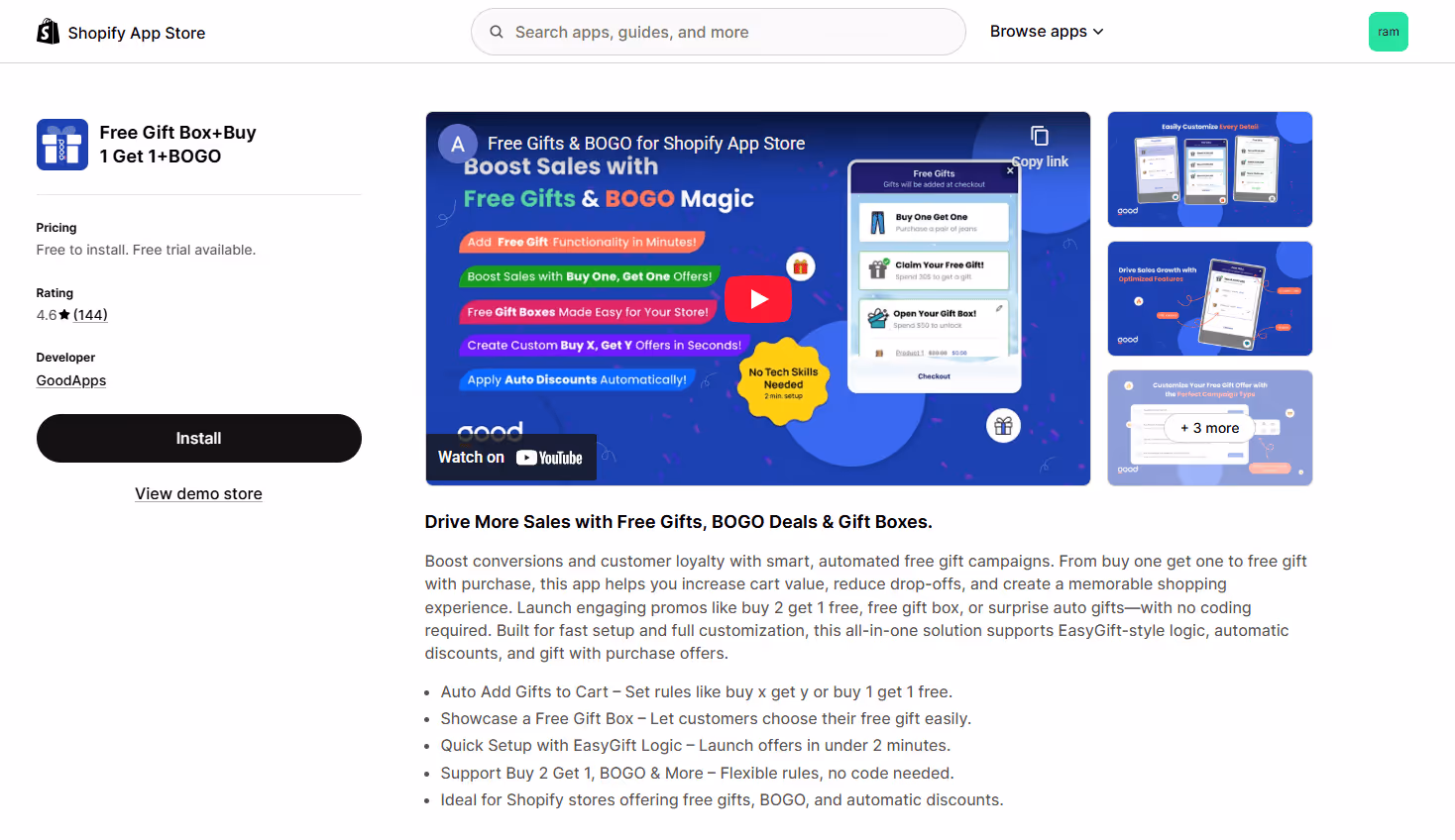 TL: Free Gift Buy X Get Y BOGO is an auto-add-to-cart app that combines gift rules with progress bar rewards and also includes volume discounts and bundle popups.