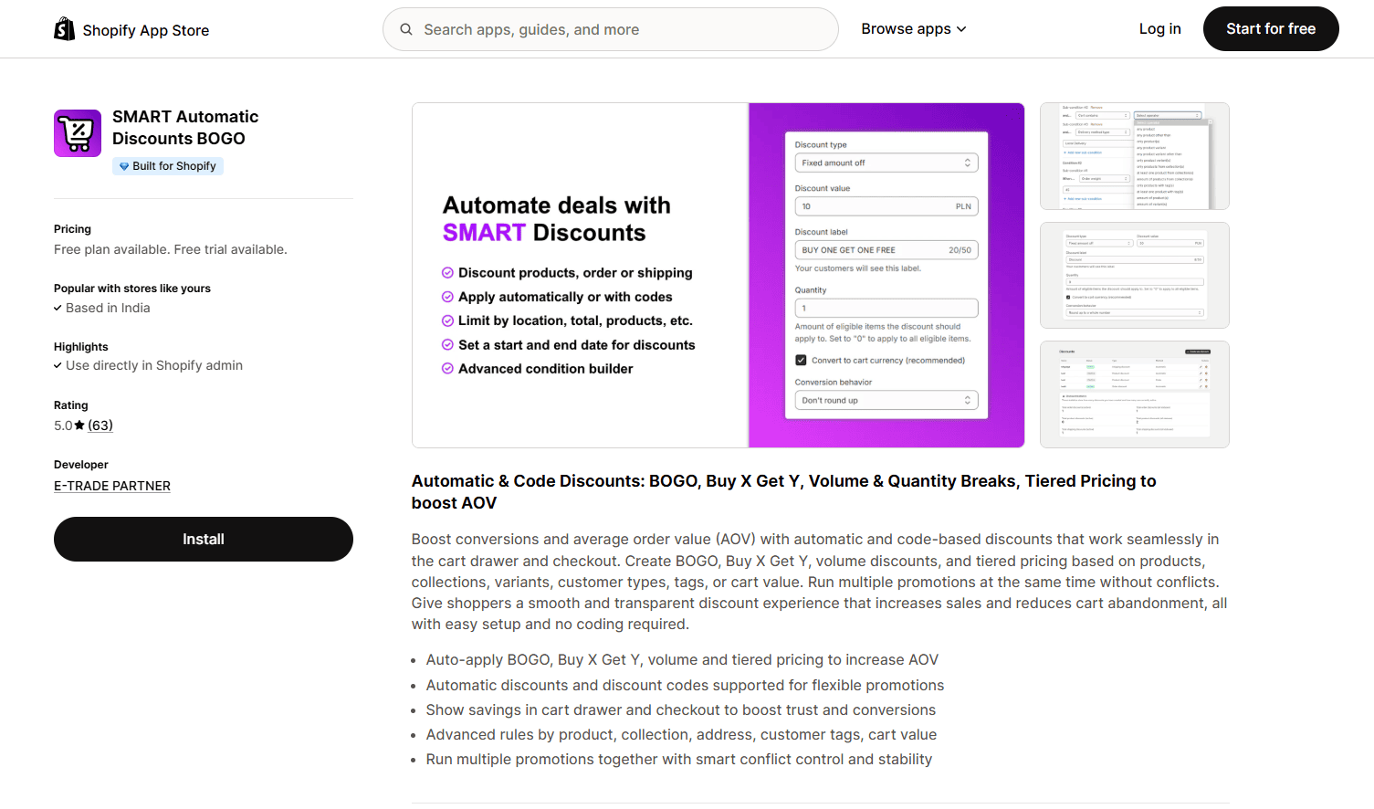 SMART Automatic Discounts BOGO is one of the lowest priced Shopify BOGO app (i.e. $3 less than other options. It offers solid discount rule controls for running BOGO offers.