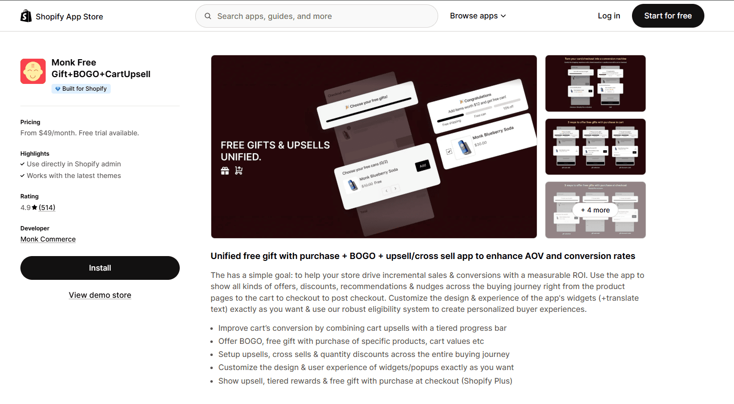 Monk Free Gift combines BOGO with upsells, cross-sells, and tiered rewards, making it a CRO-focused Shopify BOGO app.