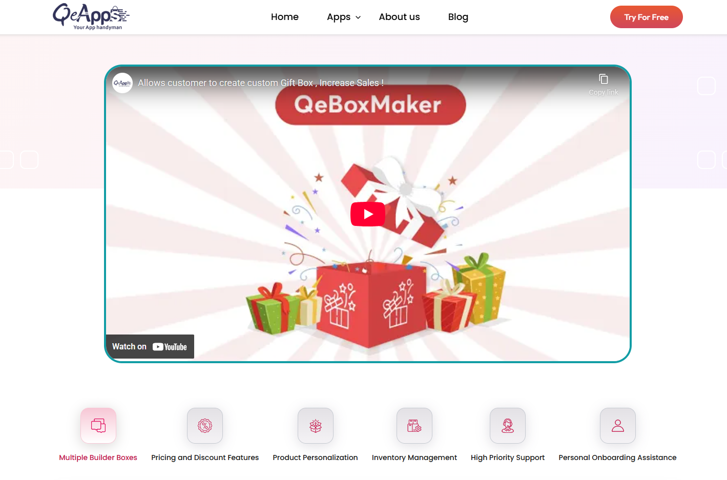 BYOB by Qe is a Shopify build-your-own-bundle app that is good for personalization, especially for gift boxes. It is designed for stores that want to offer customized gift boxes with personal messages, images, or small multimedia inputs.