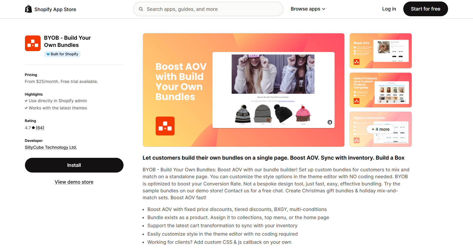 BYOB by Silly Cube is a straightforward Shopify build-your-own-bundle app focused on creating mix-and-match bundles through a simple product selection interface. Itâs basic but reliable for merchants starting out.