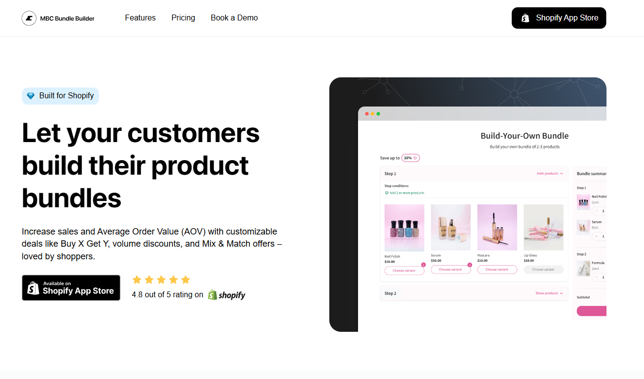 MBC Bundle Builder is a good Shopify app for conventional bundling needs such as fixed bundles, multipacks, and BOGO rules. While it supports the creation of build-your-own-bundle, it is strongest as a classic bundle discount tool.
