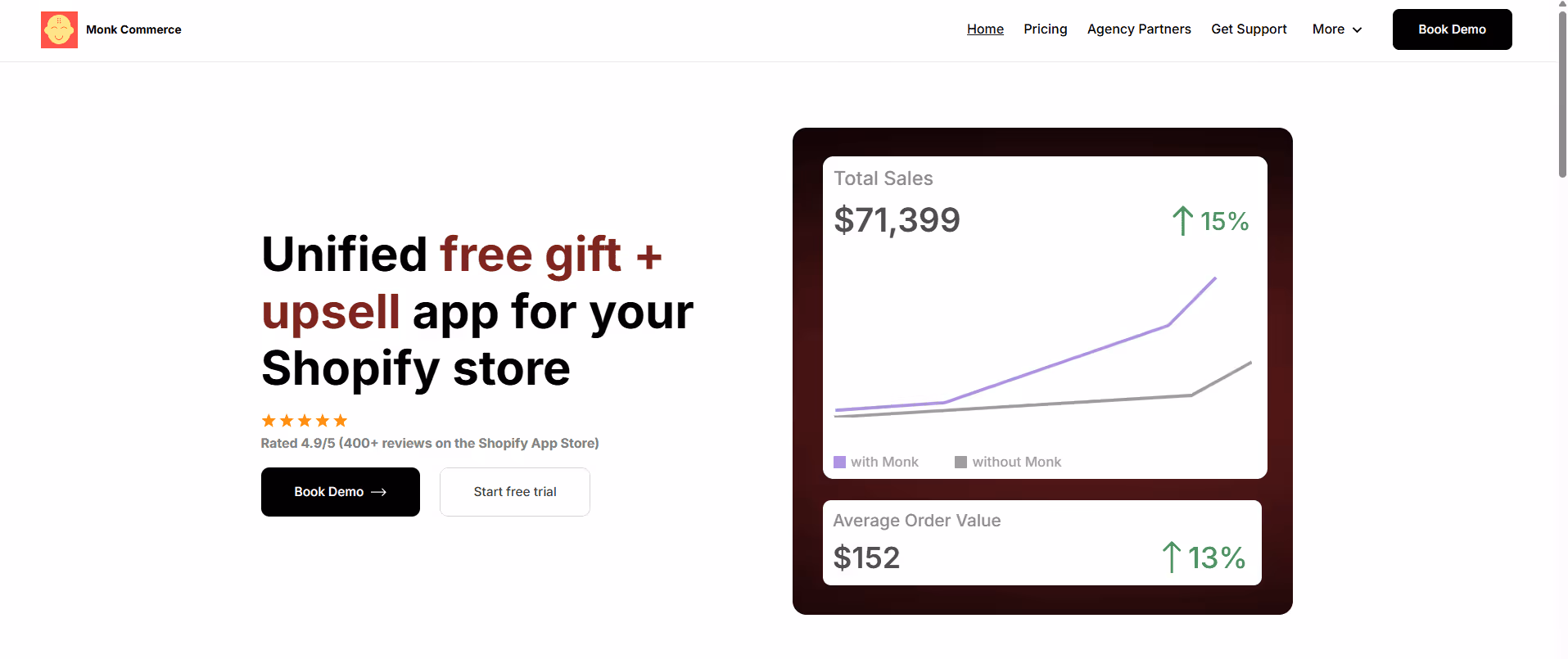 Monk positions itself as a unified free‑gift, BOGO and upsell platform.