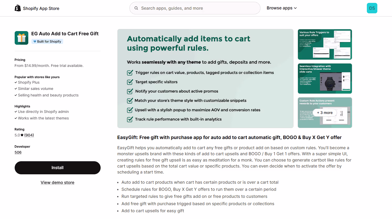 EasyGift is popular for automating free gifts. Merchants can create cartbot‑style rules to auto‑add gifts or products when a cart contains specific items or reaches a certain value. It supports scheduling BOGO and Buy‑X‑Get‑Y offers to run during specific periods.