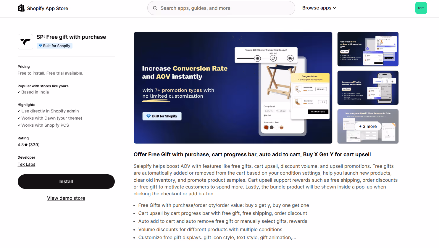 Its strengths lie in eye‑catching templates that display free gifts, BOGO or Buy‑X‑Get‑Y deals in pop‑ups or slide carts. The app automatically adds gifts when qualifying items enter the cart.