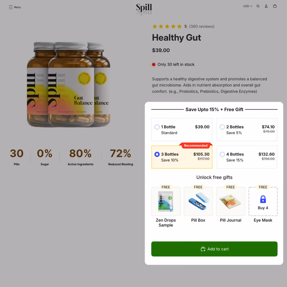 Allow your customers to build their own bundle by choosing the products and a frequency at which they would like to receive the bundle helping you increase repeat purchase and CLTV.
