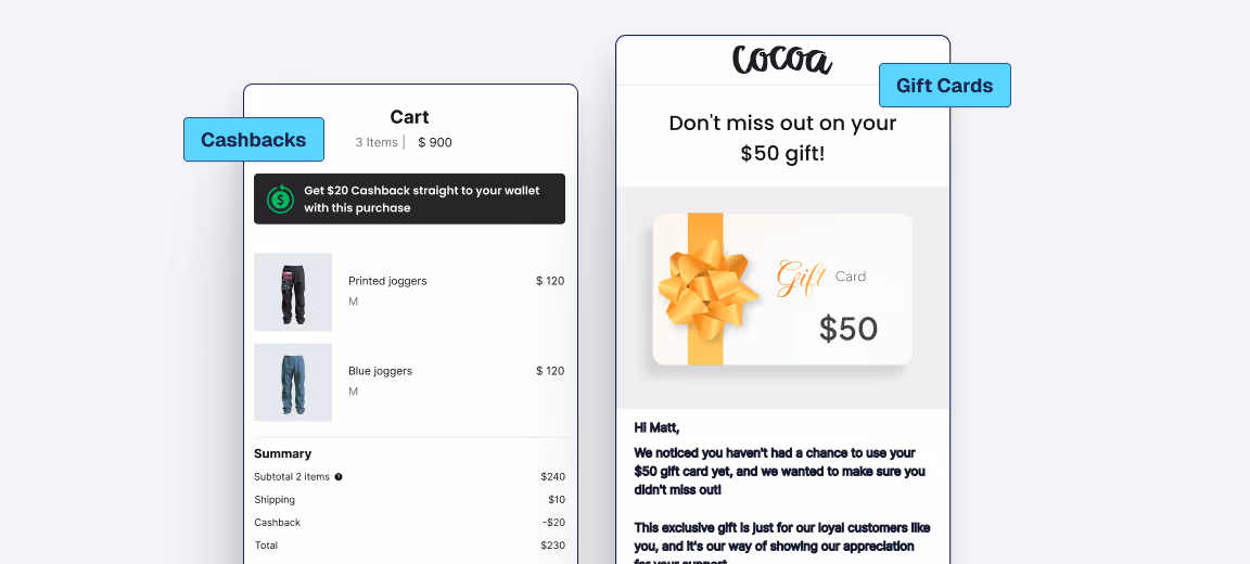 • Multiple Routes: Create cashbacks, rewards, store credit & gift cards
